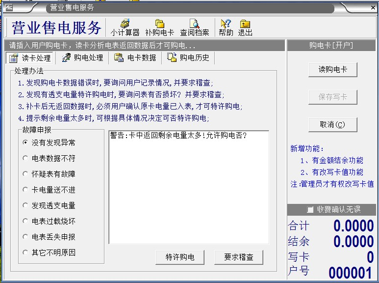 2、我們出廠之前,電表里有20度預(yù)置電量,是給客戶安裝電表用的,電表通電后,要馬上給用戶開戶,插IC卡使用,等20度預(yù)置電量用完了,再給用戶開戶,插IC卡,電表就不識別了。