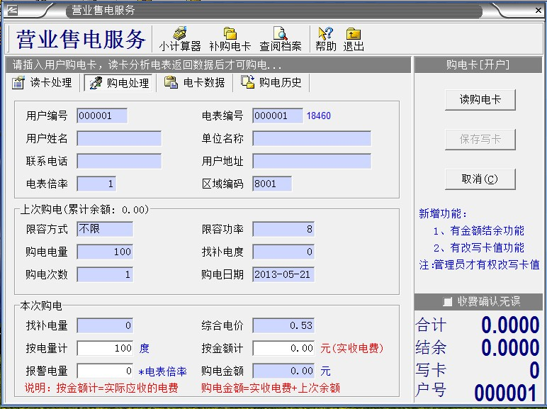 3、電表第一次使用,電表里有20度預(yù)置電量,是不能用完,要馬上給用戶開戶,插IC卡使用,第二次是沒關(guān)系的,用完了再沖也是可以的。