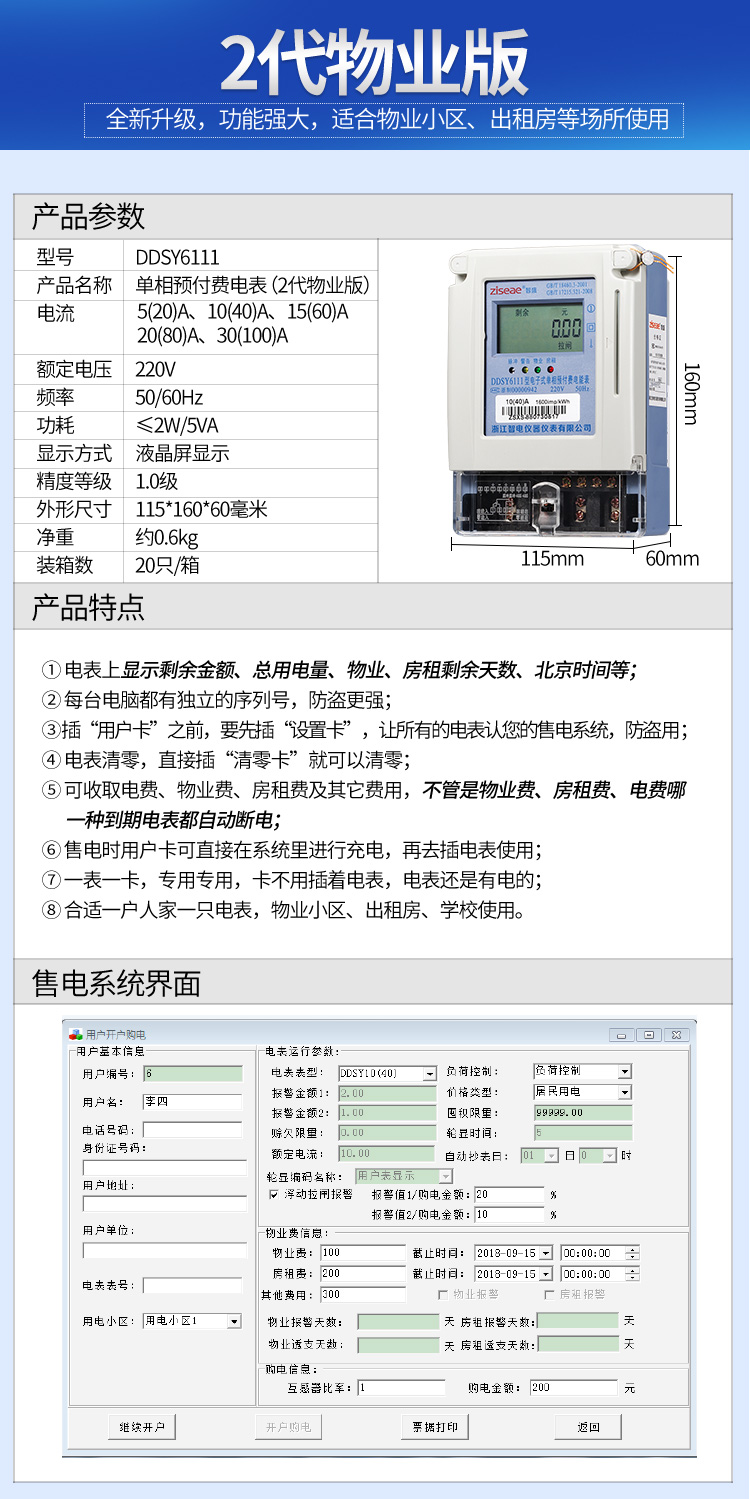 (2)預(yù)付費電表的功能:經(jīng)典款電表是上顯示剩余電量、總用電量等,1代物業(yè)版電表上顯示剩余于金額、總用電量等,2代物業(yè)版電表上顯示剩余金額、總用電量、物業(yè)、房租剩余天數(shù)、北京時間等具體功能如下。