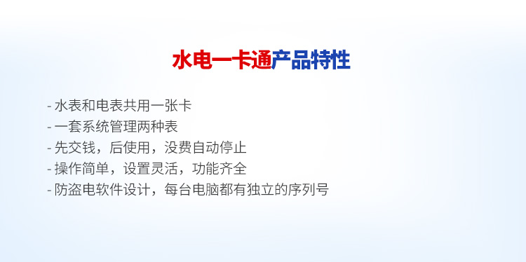 水電一卡通預付費管理系統由本公司生產的預付費電表、預付費水表、讀寫器和一卡通管理軟件構成,物業管理部門可通過本系統完成對水費、電費和天然氣費的智能化管理,無需挨家挨戶抄表收費,由用戶通過一張IC卡購水購電,先交費,后用水用電,解決了抄表累、收費難的問題,該系統是物業管理部門的好幫手, 該管理軟件界面良好,操作簡單方便,易學易用,功能齊全。